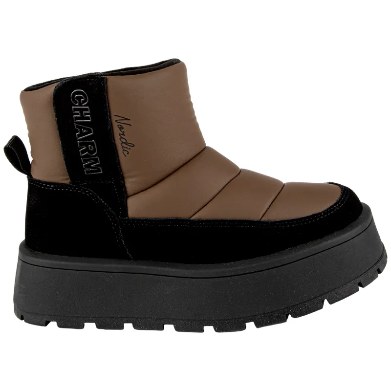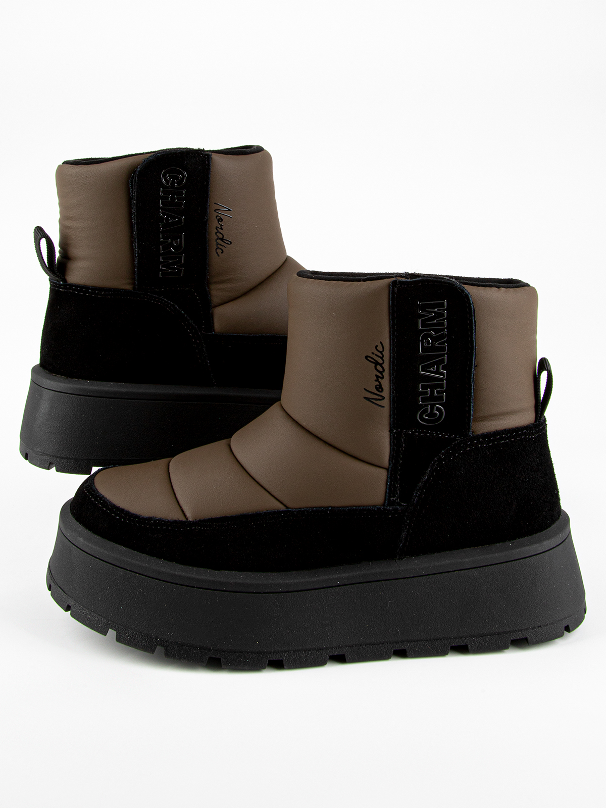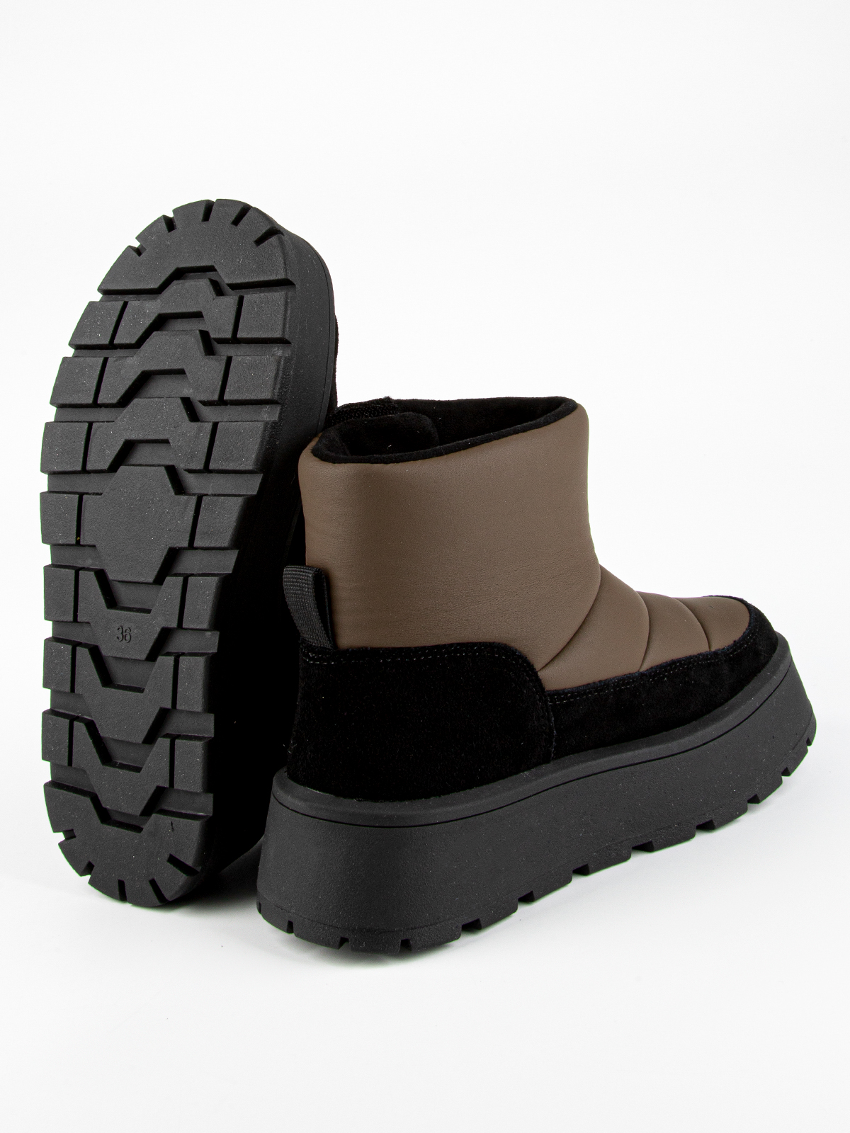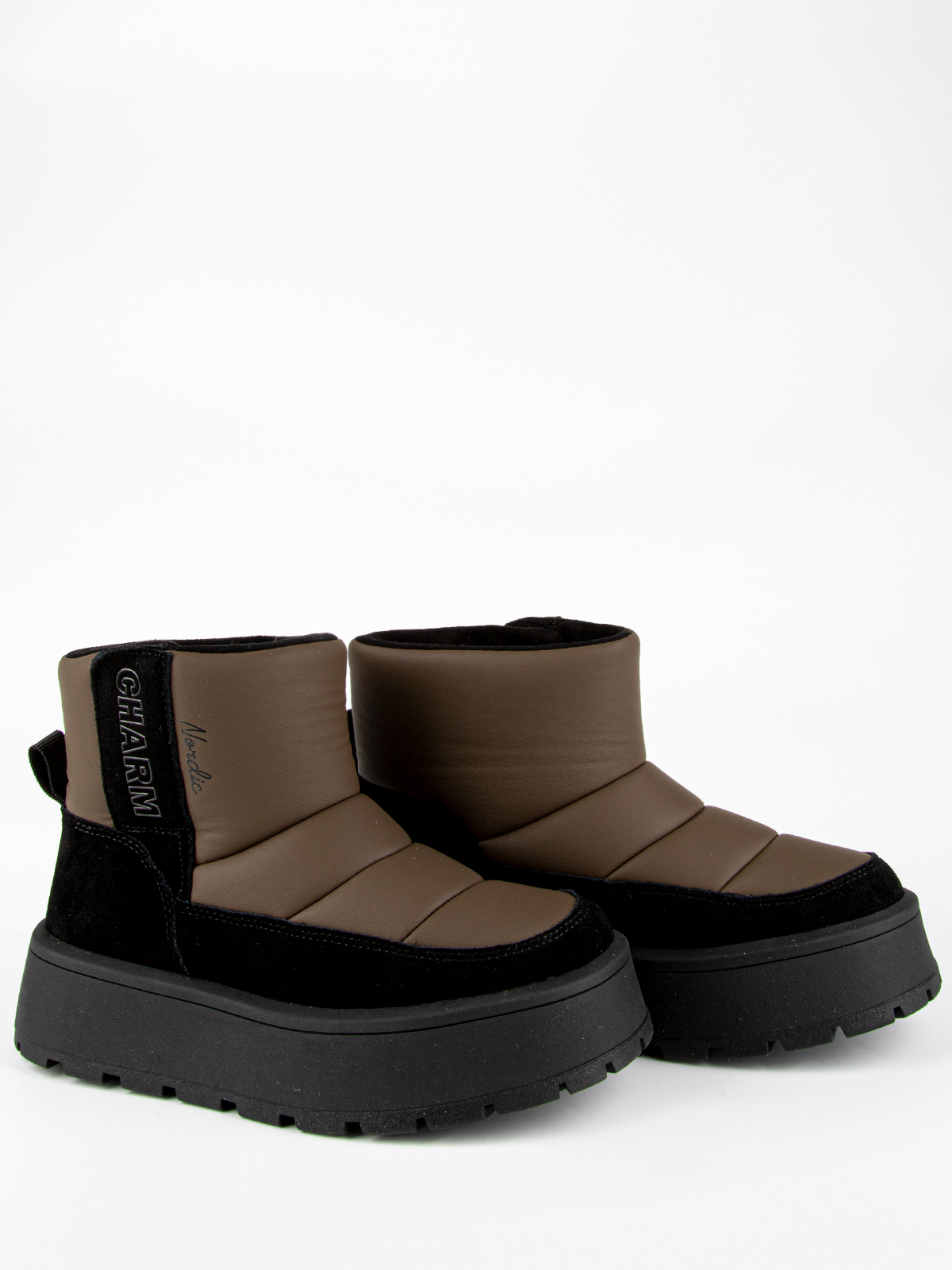 Стильные и тёплые ботинки— это не только способ выглядеть модно в любую погоду, но и надёжная защита от холода и влаги.   Верх ботинок сделан из комбинированного гидрофобного материала и натуральной замши, внутри —  натуральная шерсть с текстилем.  Стелька состоит из натурального овечьего меха (обеспечивает тепло и циркуляцию воздуха) и слоя перфорированной фольги (сохраняет тепло, надежно защищает от холода). Протектор подошвы имеет выраженный рельеф и создает максимальный эффект против скольжения. Температурный режим до минус 30!