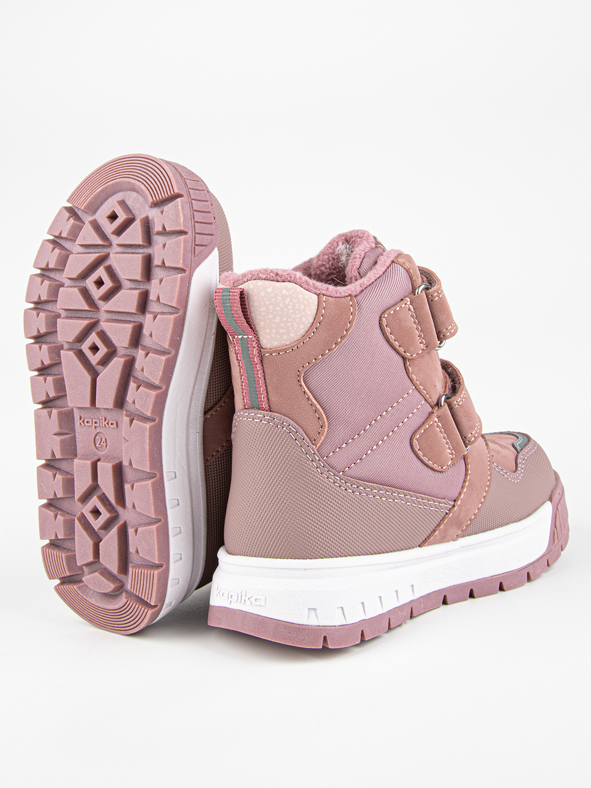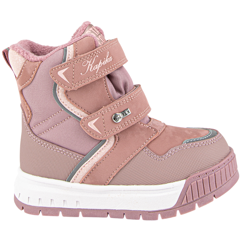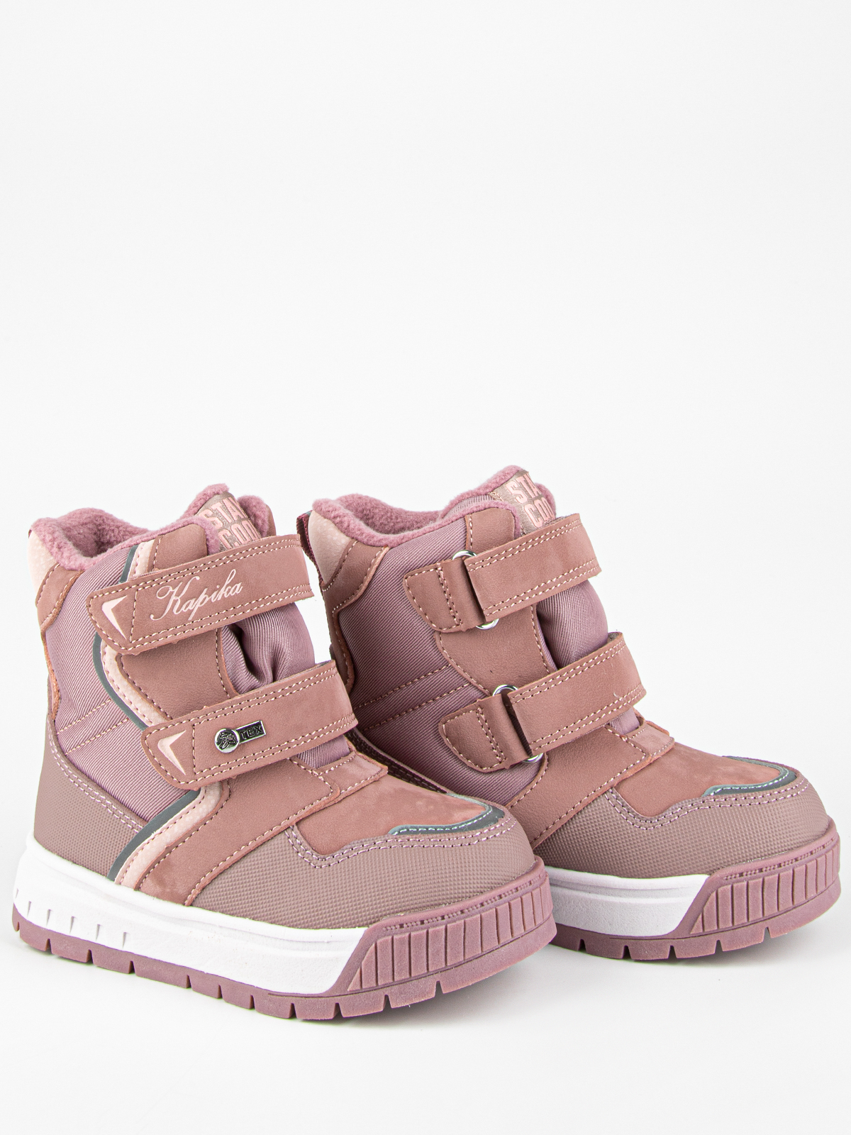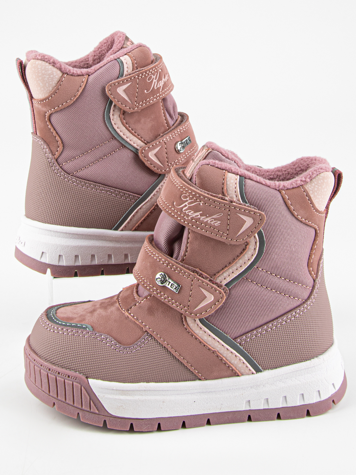 Красивые, теплые и легкие мембранные ботинки для девочки. Верх ботинок сделан из комбинированного гидрофобного материала, внутри — натуральная шерсть с текстилем.  Мембрана Kapitex сохраняет комфортный микроклимат для ног ребенка.  Язычок прошит почти до самого верха, что предотвращает попадание влаги и снега во внутрь обуви. Стелька состоит из натурального овечьего меха (обеспечивает тепло и циркуляцию воздуха) и слоя перфорированной фольги (сохраняет тепло, надежно защищает от холода). Отлично регулируются по полноте и подъему с помощью двух застежек-липучек. Нескользящая подошва. Не промокают.  Температурный режим носки от 0 до минус 25!