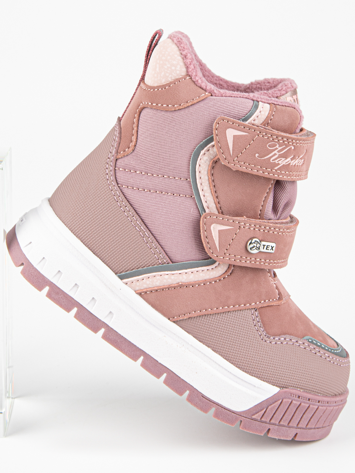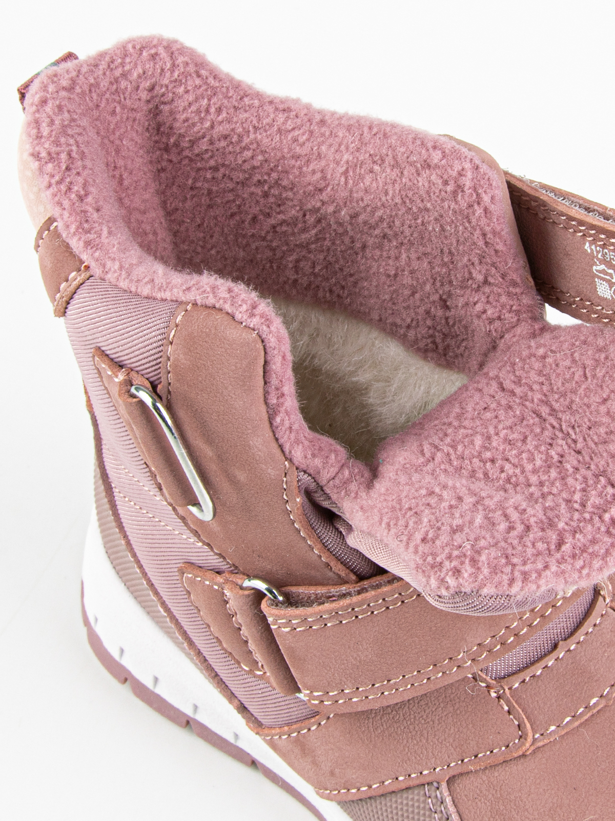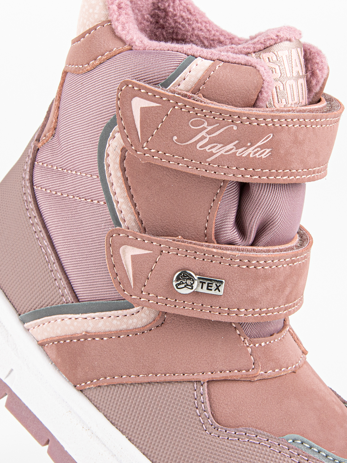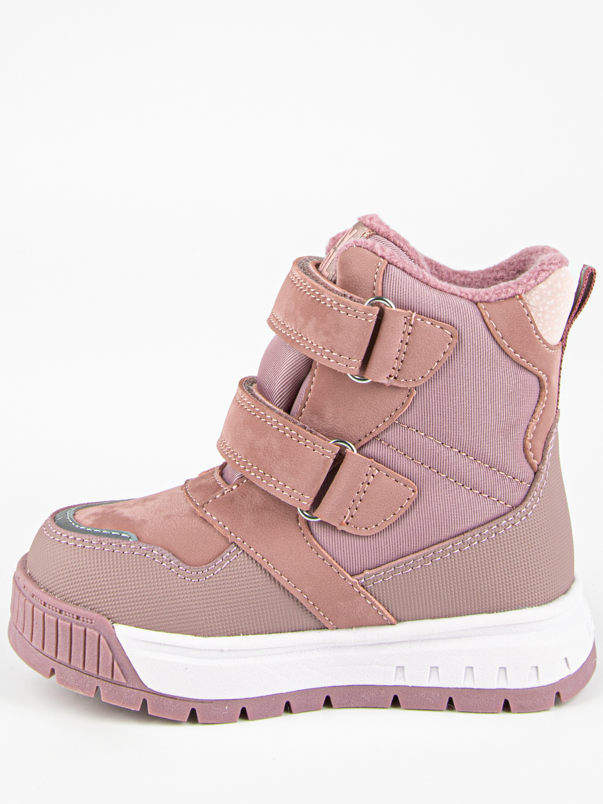 Красивые, теплые и легкие мембранные ботинки для девочки. Верх ботинок сделан из комбинированного гидрофобного материала, внутри — натуральная шерсть с текстилем.  Мембрана Kapitex сохраняет комфортный микроклимат для ног ребенка.  Язычок прошит почти до самого верха, что предотвращает попадание влаги и снега во внутрь обуви. Стелька состоит из натурального овечьего меха (обеспечивает тепло и циркуляцию воздуха) и слоя перфорированной фольги (сохраняет тепло, надежно защищает от холода). Отлично регулируются по полноте и подъему с помощью двух застежек-липучек. Нескользящая подошва. Не промокают.  Температурный режим носки от 0 до минус 25!