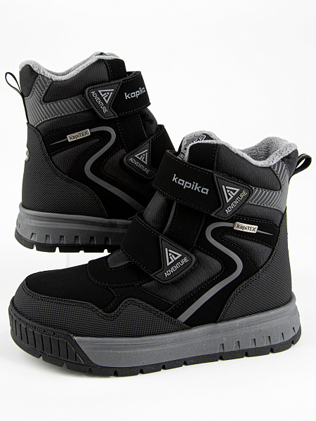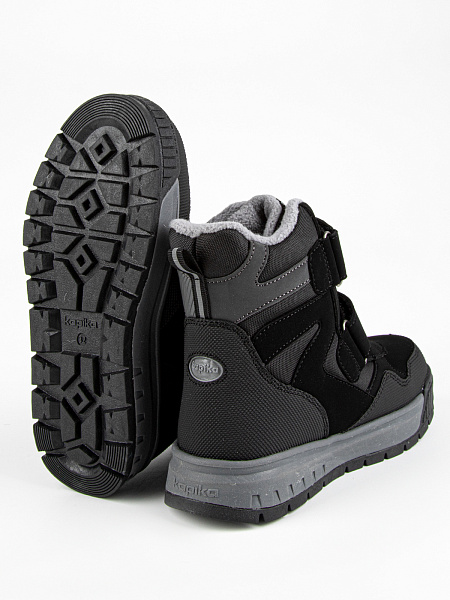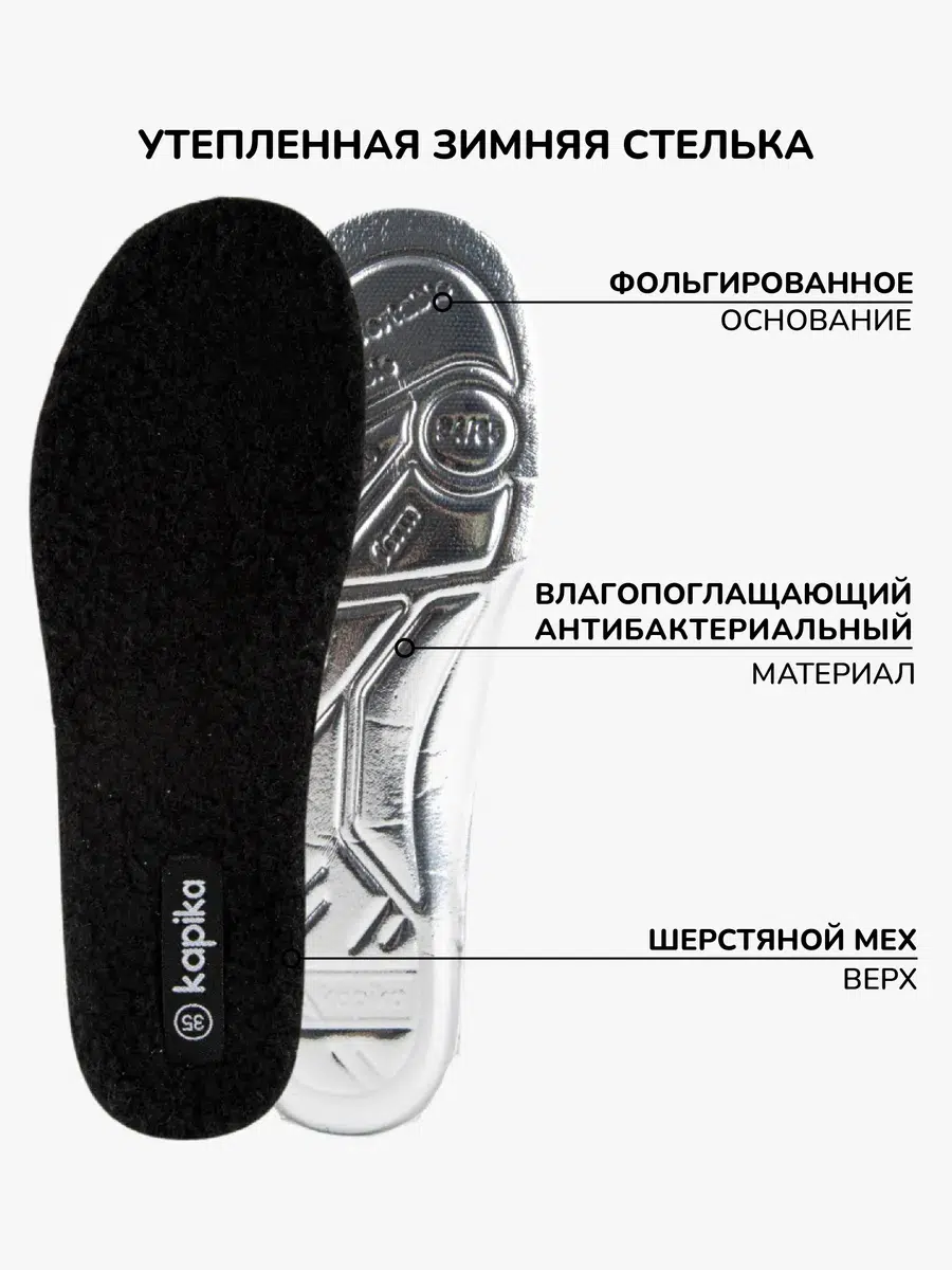 Стильные, теплые и легкие мембранные ботинки для мальчиков для зимы. Верх ботинок сделан из комбинированного водонепроницаемого материала, внутри — натуральная шерсть с текстилем. Мембрана Kapitex сохраняет комфортный микроклимат для ног ребенка. Стелька состоит из натурального овечьего меха (обеспечивает тепло и циркуляцию воздуха) и слоя перфорированной фольги (сохраняет тепло, надежно защищает от холода). Отлично регулируются по полноте и подъему с помощью двух застежек-липучек. Подошва, состоящая из материалов ЭВА и резины, обеспечивает легкость и предотвращает скольжение. Не промокают. От 0 до минус 30.