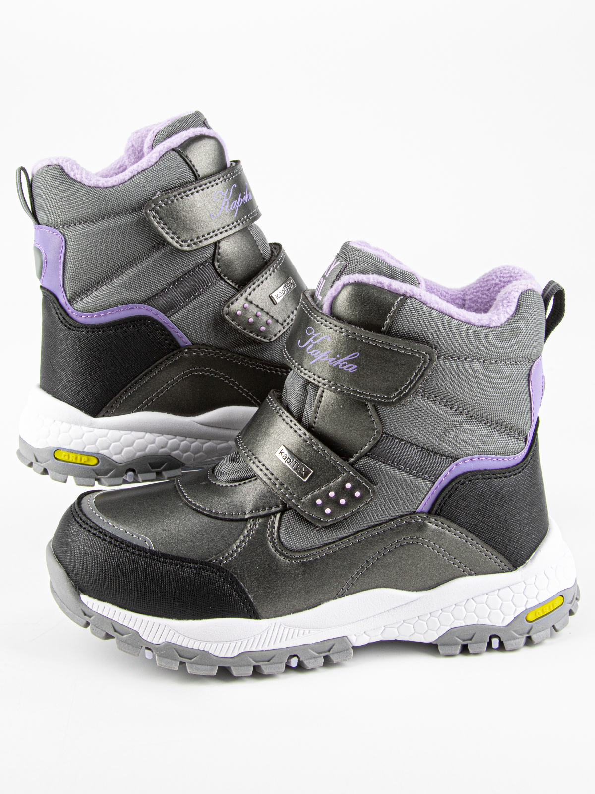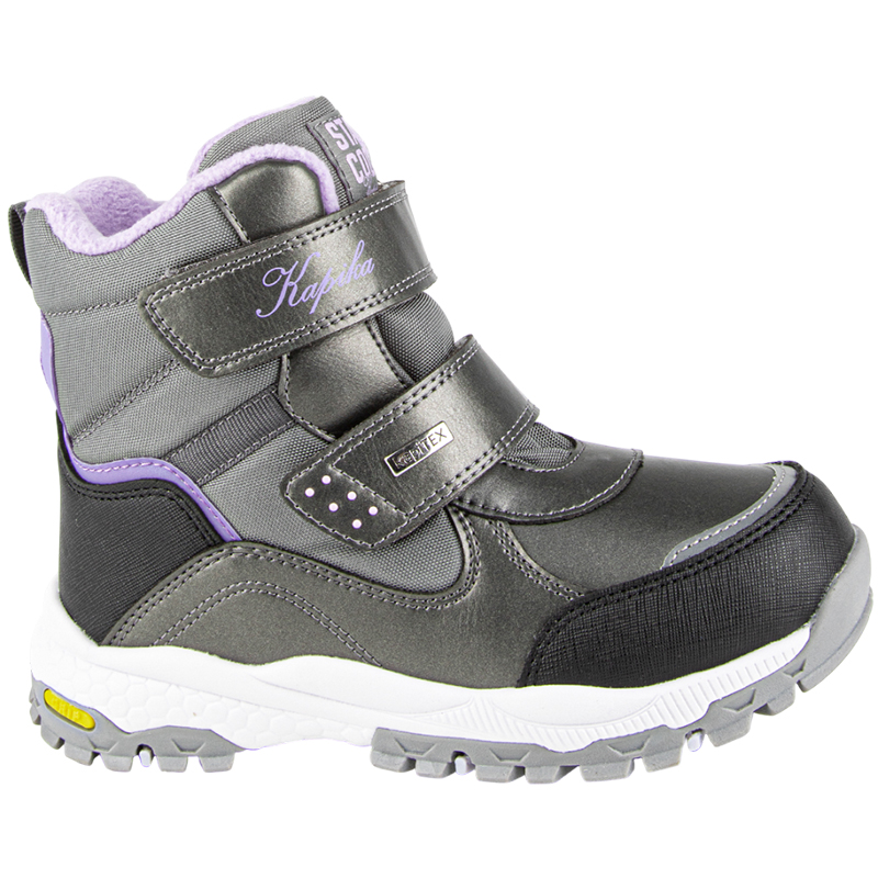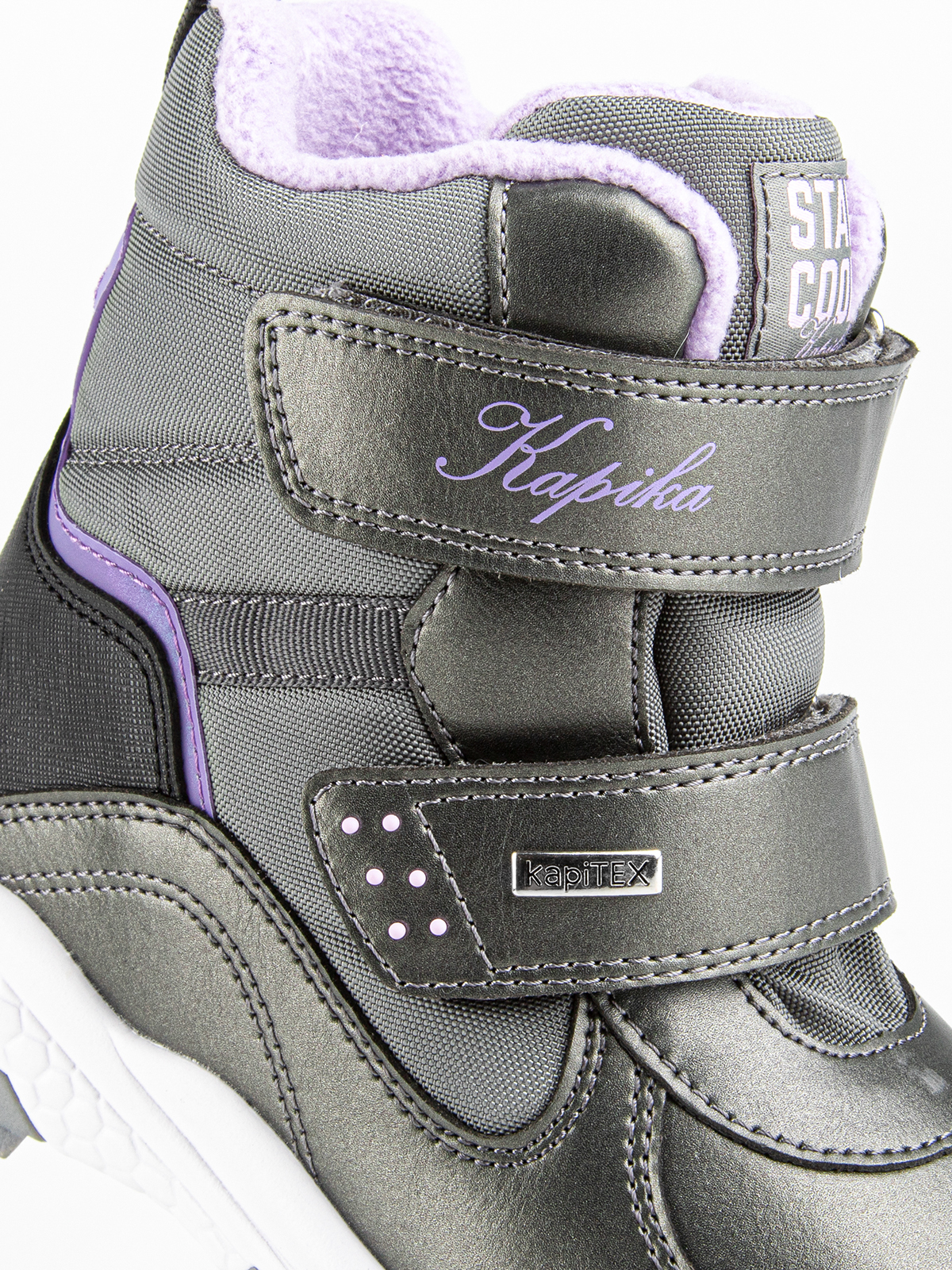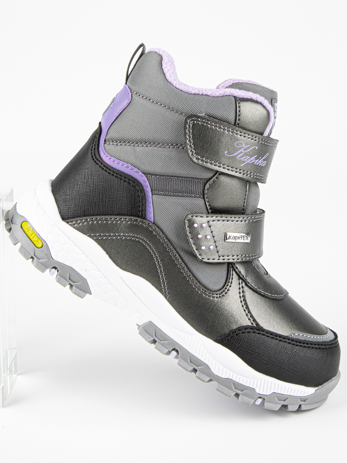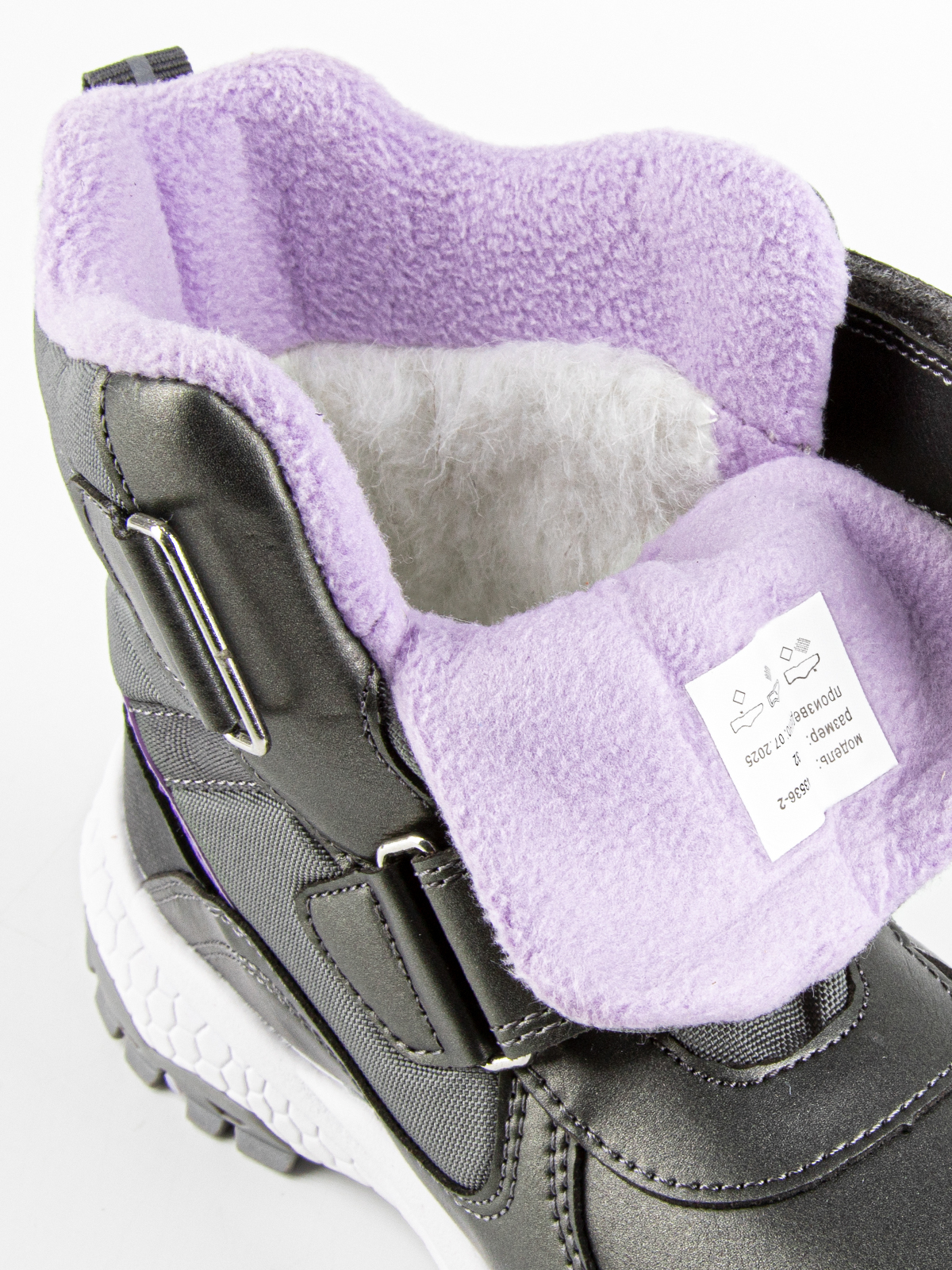Эффектные, теплые и легкие мембранные ботинки для девочек на модной легкой платформе. Верх ботинок сделан из комбинированного гидрофобного материала, внутри —  мембрана и натуральная шерсть с текстилем.  Стелька состоит из натурального овечьего меха (обеспечивает тепло и циркуляцию воздуха) и слоя перфорированной фольги (сохраняет тепло, надежно защищает от холода).  Не промокают. Протектор подошвы имеет выраженный рельеф и создает максимальный эффект против скольжения.