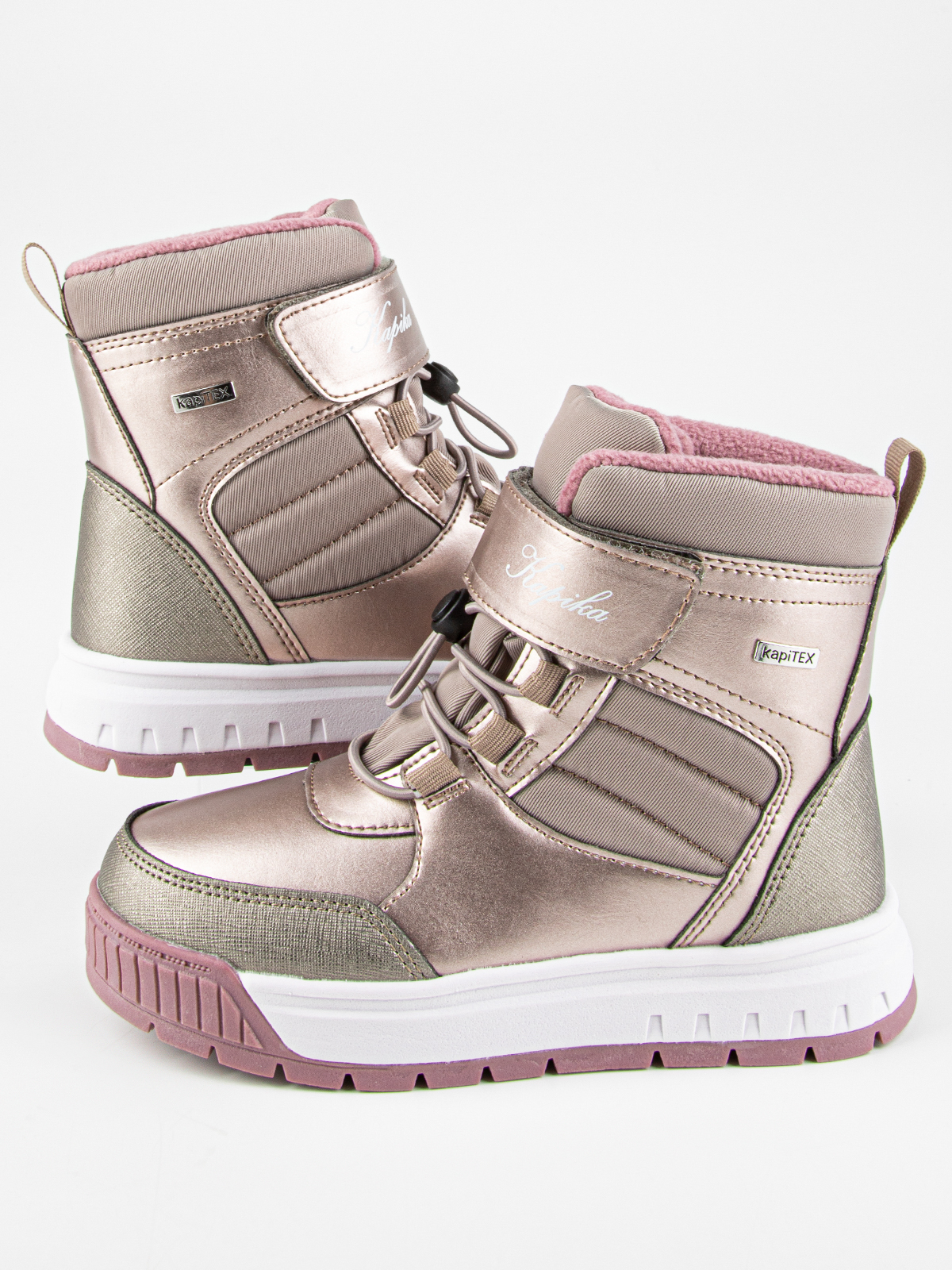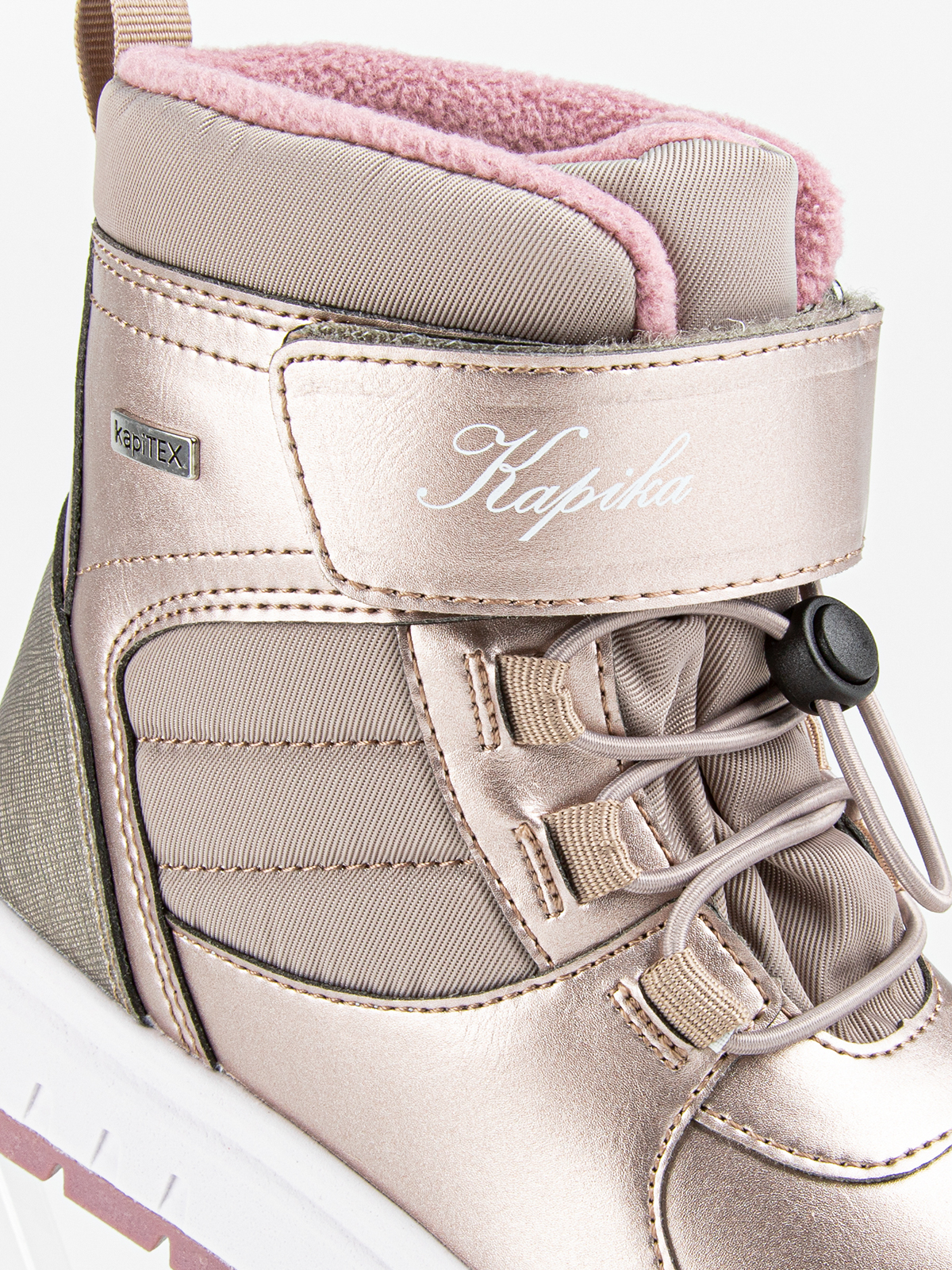 Эффектные, теплые и легкие мембранные ботинки для девочек на модной легкой платформе. Верх ботинок сделан из комбинированного гидрофобного материала, внутри — мембрана и натуральная шерсть с текстилем. Стелька состоит из натурального овечьего меха (обеспечивает тепло и циркуляцию воздуха) и слоя перфорированной фольги (сохраняет тепло, надежно защищает от холода). Не промокают. Протектор подошвы имеет выраженный рельеф и создает максимальный эффект против скольжения.