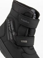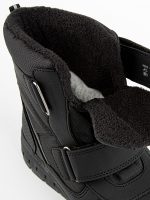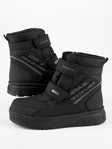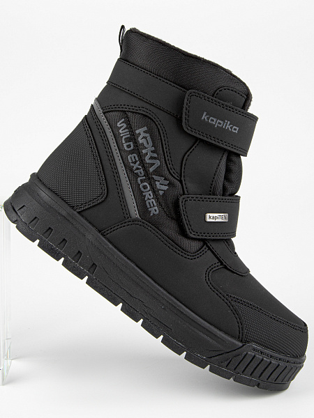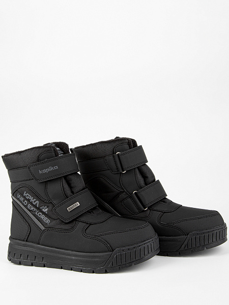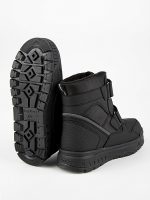 Эффектные, теплые и легкие мембранные ботинки для мальчика на  легкой платформе. Верх ботинок сделан из комбинированного гидрофобного материала, внутри —  мембрана и натуральная шерсть с текстилем.  Стелька состоит из натурального овечьего меха (обеспечивает тепло и циркуляцию воздуха) и слоя перфорированной фольги (сохраняет тепло, надежно защищает от холода).  Не промокают. Протектор подошвы имеет выраженный рельеф и создает максимальный эффект против скольжения.