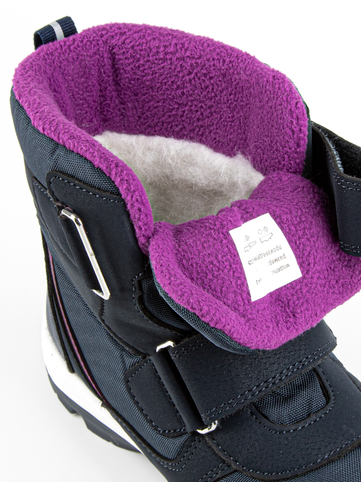 Эффектные, теплые и легкие мембранные ботинки для девочек на модной легкой платформе. Верх ботинок сделан из комбинированного гидрофобного материала, внутри —  мембрана и натуральная шерсть с текстилем.  Стелька состоит из натурального овечьего меха (обеспечивает тепло и циркуляцию воздуха) и слоя перфорированной фольги (сохраняет тепло, надежно защищает от холода).  Не промокают. Протектор подошвы имеет выраженный рельеф и создает максимальный эффект против скольжения.